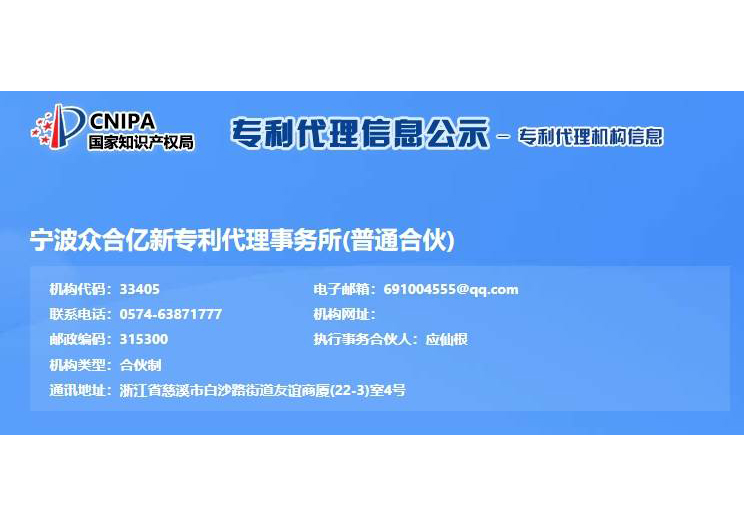浙江億新知識產(chǎn)權(quán)服務有限公司前身為慈溪眾合知識產(chǎn)權(quán)代理事務所,創(chuàng)始于2004年,為了服務更多的創(chuàng)新企業(yè),實現(xiàn)“服務億萬創(chuàng)新企業(yè)”的理念,后更名為浙江億新知識產(chǎn)權(quán),旗下公司包括:寧波眾合億新專利代理事務所(機構(gòu)代碼33405)、中范(北京)認證有限公司。其中寧波眾合億新專利代理事務所是慈溪市科技服務聯(lián)盟理事單位,前灣區(qū)知識產(chǎn)權(quán)工作站。公司位于浙江省慈溪市文化商務區(qū)友誼商廈,并在北京、青島設有辦事處。
